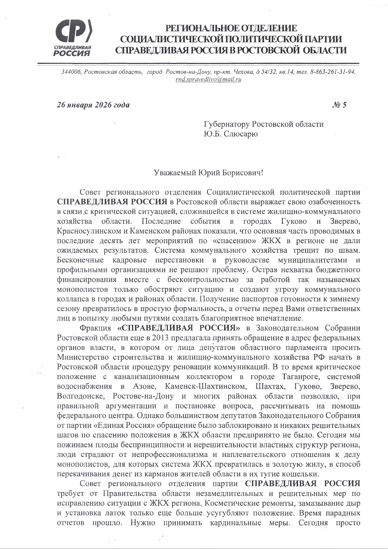 Совет регионального отделения принял обращение в адрес Губернатора Ростовской области Ю.Б. Слюсаря по критическом положении в жилищно-коммунальной системе региона.