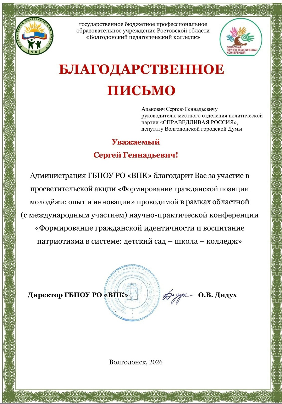 Депутат Волгодонской городской Думы, председатель Совета местного отделения СПРАВЕДЛИВОЙ РОССИИ в городе Волгодонске Сергей Апанович отмечен благодарностью руководства "Волгодонского педагогического колледжа" за участие в воспитании молодежи.