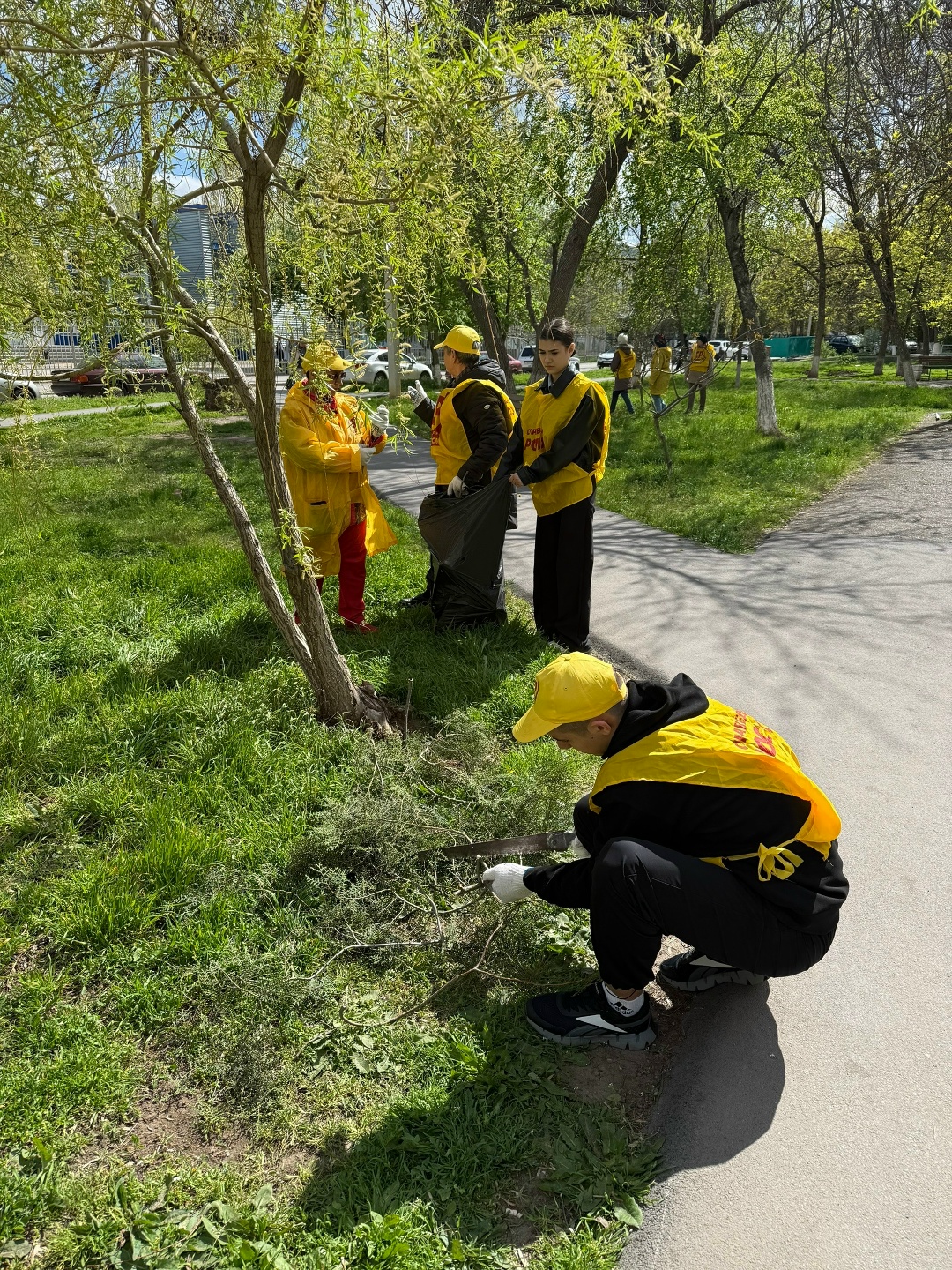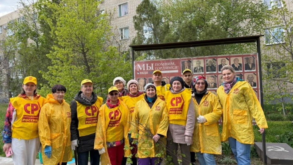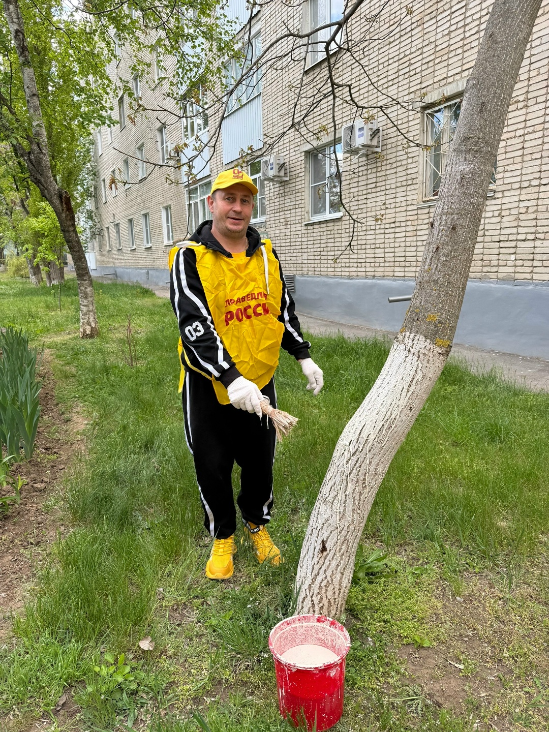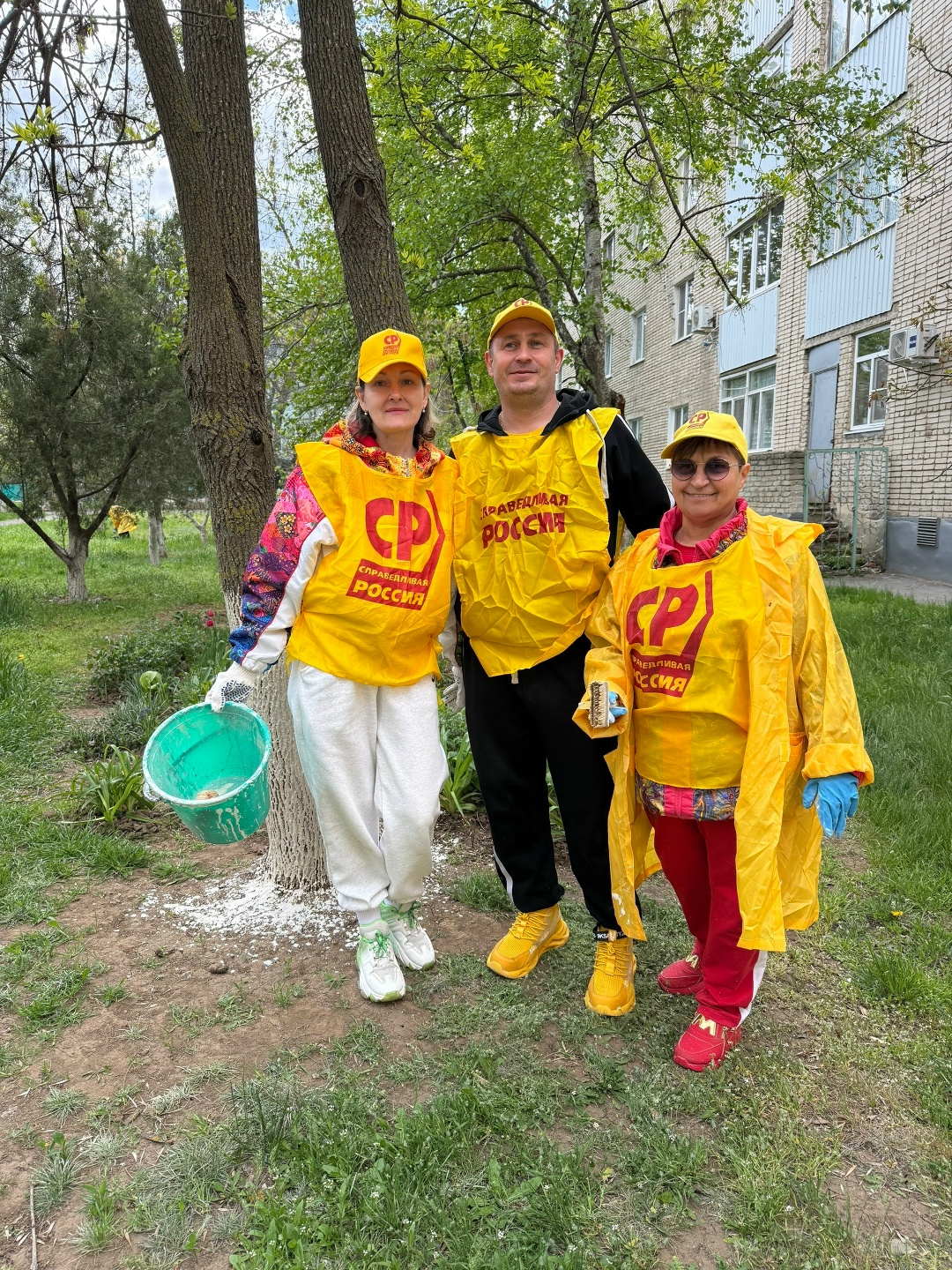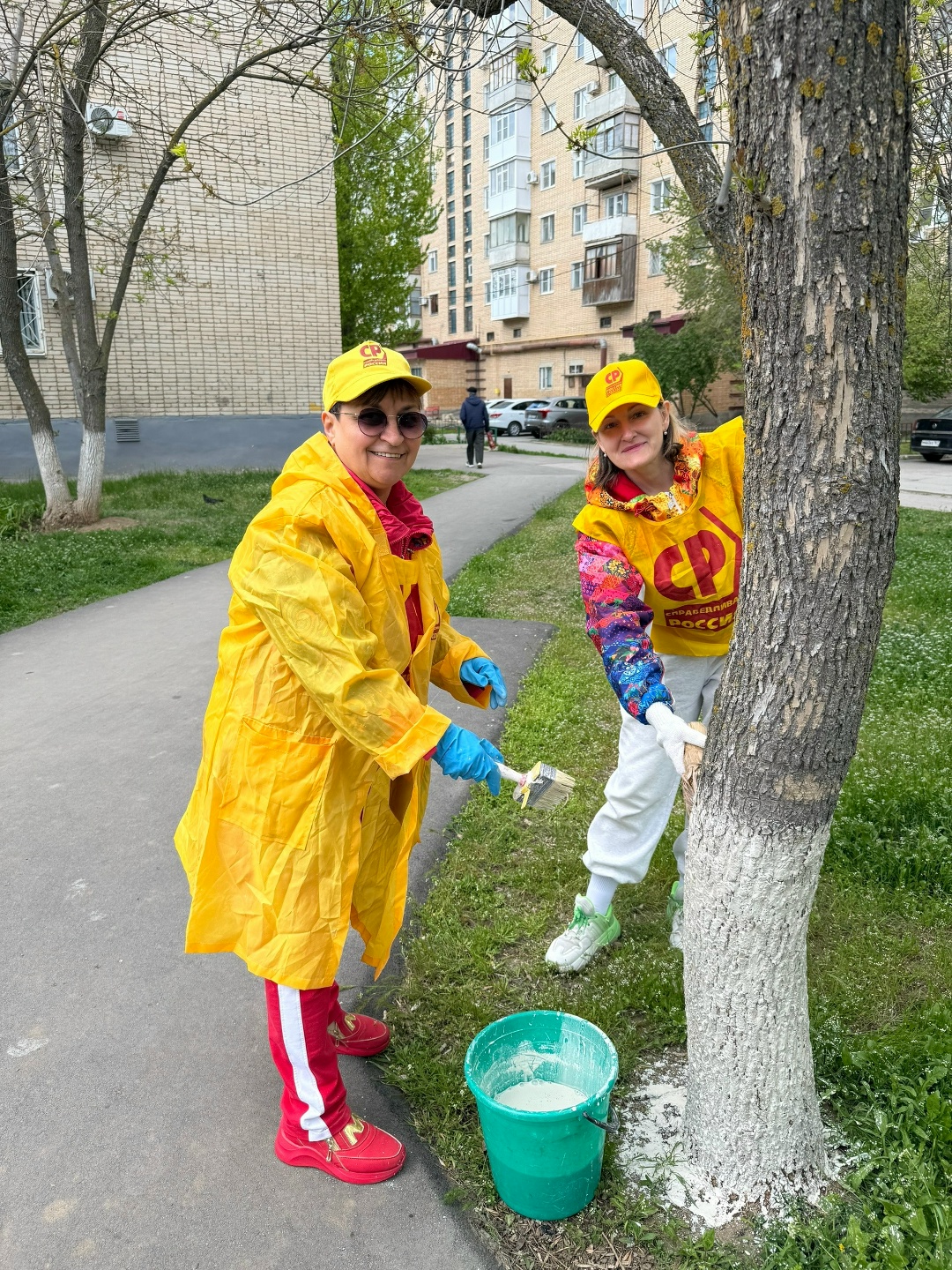 Теплым весенним днём активные жители округа и представители партии убрали мусор, обрезали поросль и побелили деревья в сквере "Ветеранов войны и труда.